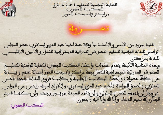 تلقينا بمزيد من اﻷسى و اﻷسف نبأ وفاة عمة أخينا عبد العزيز لمسافري عضو المجلس الوطني للنقابة الوطنية للتعليم العضو في الفدرالية الديمقراطية للشغل و اﻷمين اﻹقليمي للنقابة بمراكش، وبهذه المناسبة اﻷليمة يتقدم عضوات وأعضاء المكتب الجهوي للنقابة الوطنية للتعليم العضو في الفدرالية الديمقراطية للشغل بجهة مراكش تانسيفت الحوز أصالة عن أنفسهم و نيابة عن عضوات و أعضاء المكاتب الإقليمية و مكاتب فروع النقابة بالجهة بأحر التعازي والمواساة ﻷخينا عبد العزيز لمسافري راجين من العلي القدير أن يلهمه وعائلته الصبر والسلوان، وأن يتغمد الفقيدة بموفور رحمته و يسكنها فسيح جنانه إنه مجيب الدعاء. وإنا لله وإنا إليه راجعون.