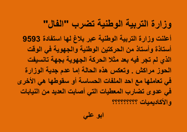 أعلنت وزارة التربية الوطنية عبر بلاغ لها عن استفادة 9593 أستاذة وأستاذ من الحركتين الوطنية والجهوية في الوقت الذي لم تجر فيه بعد مثلا الحركة الجهوية بجهة تانسيفت الحوز مراكش . وتعكس هذه الحالة إما عدم جدية الوزارة في تعاملها مع احد الملفات الحساسة أو سقوطها هي الأخرى في عدوى تضارب المعطيات التي أصابت العديد من النيابات والأكاديميات ؟؟؟؟؟؟؟؟؟