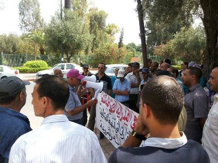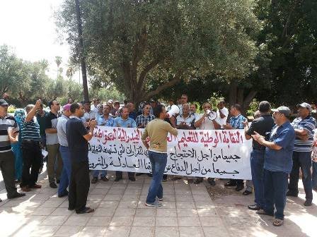 نظم المكتب الإقليمي للنقابة الوطنية للتعليم العضو في الفيدرالية الديمقراطية للشغل وقفة احتجاجية أمام نيابة وزارة التربية الوطنية بإقليم مراكش حضرها العشرات من نساء ورجال التعليم من بينهم مسئولون قدامى وجدد في الأجهزة الإقليمية رغم ارتفاع درجات الحرارة وظروف الإحصاء والحملة المضادة التي خاضها الطابور الخامس الذي يقوده الكاتب العام المخلوع والذي أدى دور المخزن بشكل قديم ورديء . وقد ابتدأت الوقفة في الساعة الحادية عشرة وربع وتم خلالها ترديد العديد من الشعارات التي تدين سياسة الحكومة في تدبير قطاع التعليم ، خاصة نظام السخرة الجديد الذي أضاف من خلاله رئيس الحكومة سبعة أشهر للمقبلين على التقاعد في نهاية شهر دجنبر 2014 أو في بداية سنة 2015 . كما لاحظ بعض نساء ورجال التعليم التحركات المشبوهة لمجموعة من البصاصين الموالين للكاتب العام المخلوع وهم يراقبون الوقفة من خلف جدران النيابة أو من وراء الأشجار ..