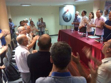 كما وقف الأخ الفاتيحي على النتائج الايجابية حول اللقاء مع وزير التشغيل والموقف السلبي والغير المحايد للحزب الحاكم والذي يدعم المنشقين وذلك من خلال حضور نائب الكاتب العام للاتحاد الوطني للشغل في لقاء سيدي قاسم ودعمهم في اجتماع اكادير في جماعة الدشيرة..وختم العرض بان الكاتب المخلوع قدم 4 شكايات ضد الفيدرالية الديمقراطية للشغل حول اجتماع الوطني ل21 يونيو 2014 والمؤتمر الوطني الرابع ومقر الرباط ومقر الدار البيضاء…أن المعركة ليست سهلة ولكن الفيدرالية قادرة على تجاوزها .