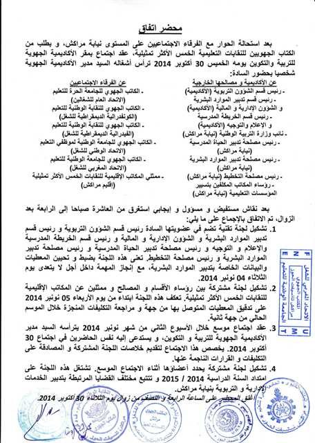 نسخة من نص الاتفاق الذي وقعه السيد مدير الأكاديمية والكتاب الجهويين للنقابات التعليمية الخمس الأكثر تمثيلية يوم 30 أكتوبر 2014 بمقر الأكاديمية