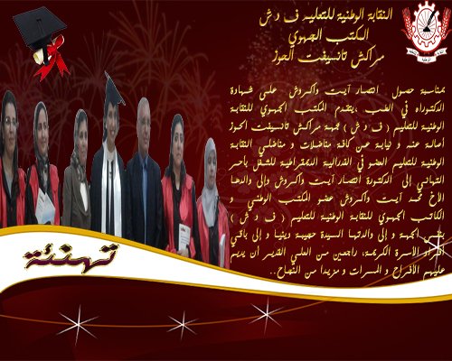 بمناسبة حصول انتصار آيت واكروش على شهادة الدكتوراه في الطب ، يتقدم المكتب الجهوي للنقابة الوطنية للتعليم ( ف د ش ) بجهة مراكش تانسيفت الحوز أصالة عنه و نيابة عن كافة مناضلات و مناضلي النقابة الوطنية للتعليم العضو في الفدرالية الديمقراطية للشغل بأحر التهاني إلى الدكتورة انتصار آيت واكروش وإلى والدها الأخ محمد آيت واكروش عضو المكتب الوطني و الكاتب الجهوي للنقابة الوطنية للتعليم ( ف د ش ) بنفس الجهة و إلى والدتها السيدة حجيبة دينيا و إلى باقي أفراد الأسرة الكريمة، راجعين من العلي القدير أن يديم عليهم الأفراح و المسرات و مزيدا من النجاح.