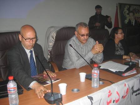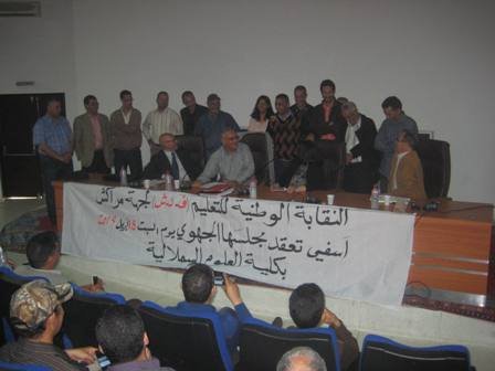 تفعيلا لقرار المكتب الوطني للنقابة للتعليم العضو في الفدرالية الديمقراطية للشغل الداعي إلى عقد مجالس جهوية في إطار التقسيم الجهوي الجديد،انعقد بكلية العلوم السملالية بجامعة القاضي عياض بمراكش يوم السبت 18 أبريل 2015 اجتماع المجلس الجهوي للنقابة الوطنية للتعليم (ف د ش) بجهة مراكش أسفي. وبعد الاستماع لكلمة المكتب الوطني التي ألقاها الأخ محمد كرميم عضو المكتب الوطني والتي وقف خلالها، عند تظاهرة فاتح ماي لهذه السنة كمناسبة للاحتجاج ضد القرارات الحكومية اللاشعبيةالمتمثلة في استهداف القدرة الشرائية للمواطنات والمواطنين، والتضييق على الحريات النقابية والتراجع عن مكتسبات الشغيلة المغربية وفي مقدمتها ملف التقاعد كما وقف عند أهمية محطة انتخابات اللجان الثنائية التي تجرى يوم 3 يونيه 2015 و ما يميزها هذه السنة من صراع قوي و منتوسيع دائرة التآمر على النقابة الوطنية للتعليم العضو في المركزية المناضلة الفيدرالية الديمقراطية للشغل .