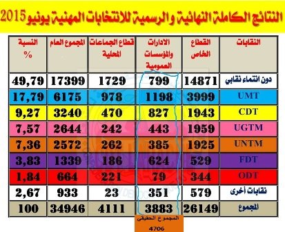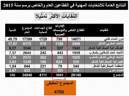 نظمت وزارة التشغيل رفقة وزارة تحديث القطاعات ندوة صحفية يوم الأربعاء 24 يونيو 2015 قدمتا خلالها عرضا أعلنتا فيه عن النتائج النهائية لانتخابات ممثلي الأجراء التي جرت يوم 03 يونيو بالنسبة للقطاع العام وما بين 1 و10 يونيو 2015 بالنسبة للقطاع الخاص والذي تم تمديد انتخاباته 10 أيام إضافية بتبريرات واهية . وما يثير الاستغراب هو أن الصحافة التي حضرت العرض و النقابات التي شاركت في هذه الانتخابات لم تتوقفا عند بعض الفضائح المعلن عنها من خلال بعض الأرقام المتعلقة بنتائج هذه الانتخابات التي طعنت في نزاهتها بعض المنظمات النقابية فمثلا العدد الإجمالي لأعضاء اللجان الثنائية بالإدارات والمؤسسات العمومية الذي ورد في أسفل الجدول الذي قدمته كل من وزارة التشغيل ووزارة تحديث القطاعات هو 3883 عضوا منتخبا . وبالعودة إلى جمع عدد أعضاء اللجان الثنائية الذي حصلت عليه كل هيأة يتبين بان المجموع هو 4706 بزيادة تقدر ب 823 عضوا .. ولحد الساعة لم تصدر الجهة التي أشرفت على تقديم نتائج هذه الانتخابات أي بلاغ لتوضيح أو تصحيح هذه الأرقام التي لا زالت تعج بها بعض المواقع الالكترونية ، وهو ما جعل البعض يتساءل إذا كان الرقم الإجمالي الذي تم الإعلان عنه صحيحا فمن أين جاءت الوزارة الوصية بأكثر من 800 عضو من اللجان الثنائية ؟ وهل اقتطعت هذا العدد من حصة الفيدرالية الديمقراطية للشغل ؟ ومن هي الإطارات التي استفادت من توزيعه وضربتها بسكتة ؟