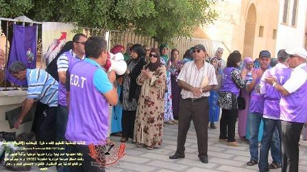 نظم المكتب الإقليمي للنقابة الوطنية للتعليم (ف د ش) بوجدة وقفة احتجاجية أمام نيابة وزارة التربية الوطنية صباح يومه الجمعة 11 شتنبر 2015 للتعبير عن الرفض المطلق للمراسلة الوزارية المشؤومة 15/352 و ما سيترتب عنها من نتائج كارثية على الاستقـرار النفسي و الاجتماعي لنساء و رجال التعليم