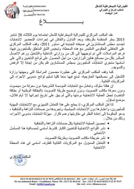 عقد المكتب المركزي للفيدرالية الديمقراطية للشغل اجتماعا يوم الثلاثاء 22 شتنبر 2015 بمقر المنظمة بالرباط، وبعد التداول والنقاش في إجراءات التحضير لانتخابات تجدديد مجلس المستشارين في صيغته الجديدة في دستور 2011، وقف المكتب المركزي على التعاطي الحكومي الملتبس مع هذه المحطة، وتبخيس الشق المتعلق بالمأجورين فيها، فرغم المراسلات التي تم توجيهها إلى كل من وزارتي الداخلية والتشغيل ورغم الاتصال المباشر بكل من مصالح هاتين الوزارتين، من أجل الحصول على لوائح الناخبين والتي على أساسها ستجري انتخابات المأجورين بمجلس المستشارين فلم يكن من إجابة إلا الرفض والتسويف