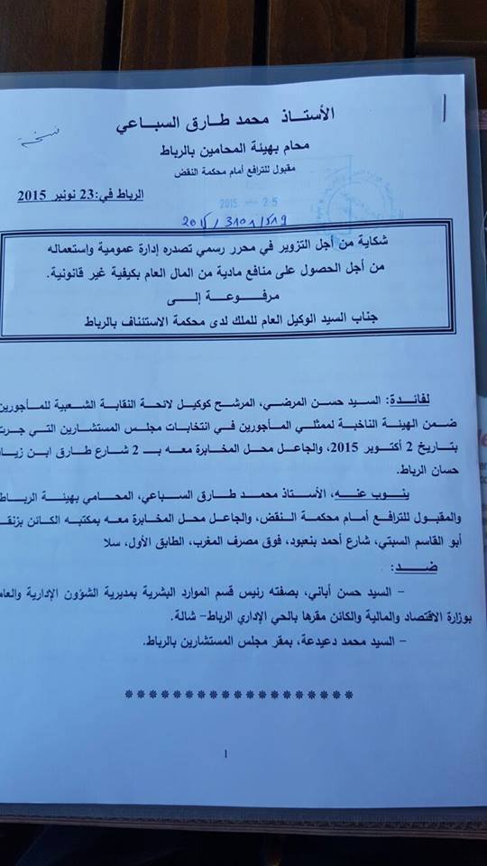 اتهم وكيل لائحة “النقابة الشعبية للمأجورين” في انتخابات مجلس المستشارين الأخيرة، حسن المرضي، من خلال شكاية تقدم بها عن طريق محاميه، محمد طارق السباعي، يوم الأربعاء 25 نونبر، لدى الوكيل العام للملك لدى محكمة الاستئناف بالرباط، (اتهم) المستشار البرلماني، محمد دعيدعة، باستعمال شهادة مزورة للحصول على منافع مادية من المال العام بكيفية غير قانونية، و ح.أ، بصفته رئيسا لقسم الموارد البشرية بمديرية الشؤون الادارية والعامة، من أجل التزوير في محرر رسمي تصدره إدارة عمومية