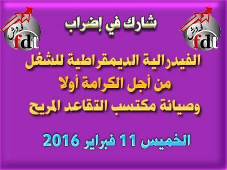 لكل هذه الأسباب قررت الفيدرالية الديمقراطية للشغل الإعلان عن قرار الإضراب العام في الوظيفة العمومية والجماعات والمؤسسات العمومية يوم 11 فبراير 2016