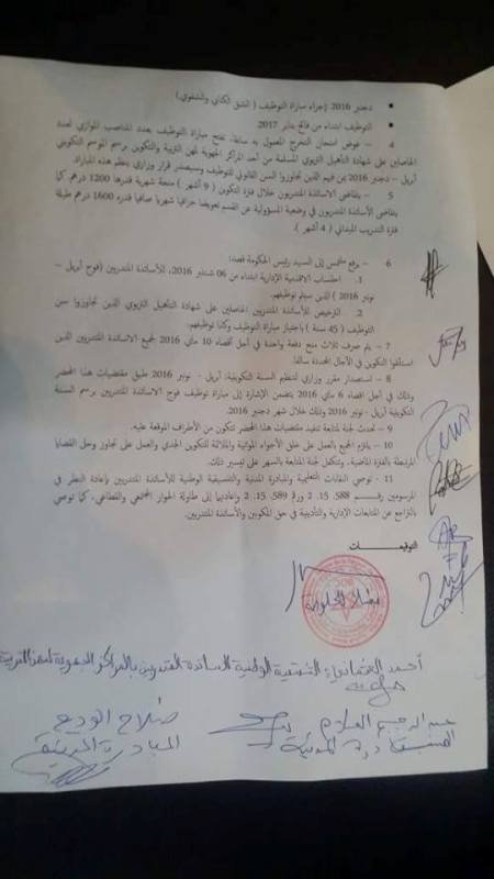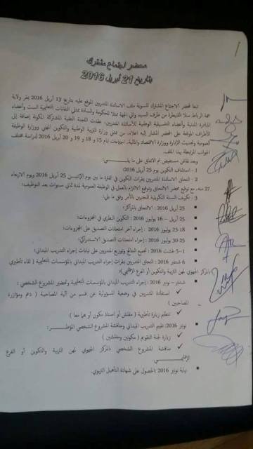انتهى يوم الأربعاء 20 أبريل 2016 اجتماع الأساتذة المتدربين وأعضاء اللجنة المشتركة المكونة من مسؤولي وزارة التربية الوطنية ووزارة المالية والاقتصاد والنقابات التعليمية وأعضاء المبادرة المدنية، الذي عقد بمقر ولاية جهة الرباط سلا القنيطرة لحل هذا الملف الذي دام زهاء ستة أشهر