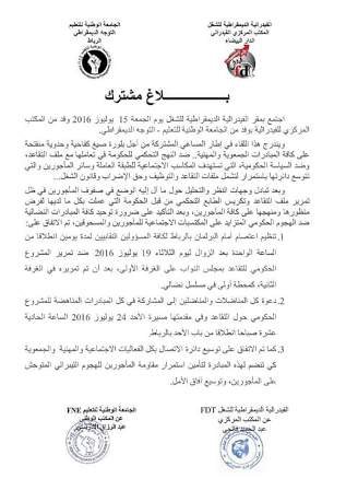 الفيدرالية الديمقراطية للشغل والجامعة الوطنية للتعليم (التوجه الديمقراطي) تدعوان مناضليها ومناضلاتها إلى المشاركة في كل المبادرات المناهضة لمشروع إصلاح التقاعد وفي مقدمتها مسيرة يوم الأحد 24 يوليوز 2016 الساعة 11 صباحا