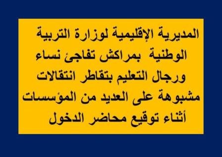 في الوقت الذي تجري فيه الاستعدادات على قدم وساق لمواجهة إكراهات الدخول المدرسي لموسم 2016 ـ 2017 نظرا لما سيعرفه من اكتضاض وخصاص مهول في الموارد البشرية تبدو المديرية الإقليمية لوزارة التربية الوطنية بمراكش خارج التغطية .. فبعد انتهاء جميع الحركات الانتقالية الوطنية والجهوية والمحلية والاستعداد للتوقيع على دخول مدرسي صعب ، يفاجأ نساء ورجال التعليم بإقليم مراكش حسب مصادر عليمة بالعديد من الانتقالات المشبوهة التي بدأت تتقاطر على بعض المؤسسات التعليمية في نفس اليوم الذي تم فيه توقيع محاضر الدخول يوم الجمعة 02 شتنبر 2016 . وهي انتقالات أغلبها بأثر رجعي يعود إلى شهر دجنبر 2015 ..