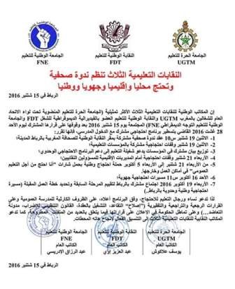 ثلاث نقابات تعليمية تنظم ندوة صحفية وتحتج محليا وجهويا ووطنيا snemas 2016-09-16 اخبار نقابية اضف تعليق Spread the love شاركها Facebook Twitter Google +