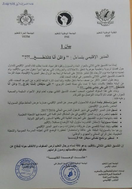 إيمانا منا كتنسيق نقابي ثلاثي بالحوار الجاد والمسؤول وكقوة اقتراحية، تقدمنا بطلب لقاء المدير الإقليمي للتداول حول قضايا تربوية وتعليمية جوهرية تتعلق بالاختلالات والخروقات التي يعرفها أسوأ دخول مدرسي بالإقليم، وتم تحديده بدعوة منه يوم الأربعاء 28 شتنبر 2016 على الساعة الرابعة بعد الزوال بمقر المديرية الإقليمية، حيث التزمنا كأعضاء للتنسيق النقابي الثلاثي بالحضور في الوقت المحدد للقاء.
