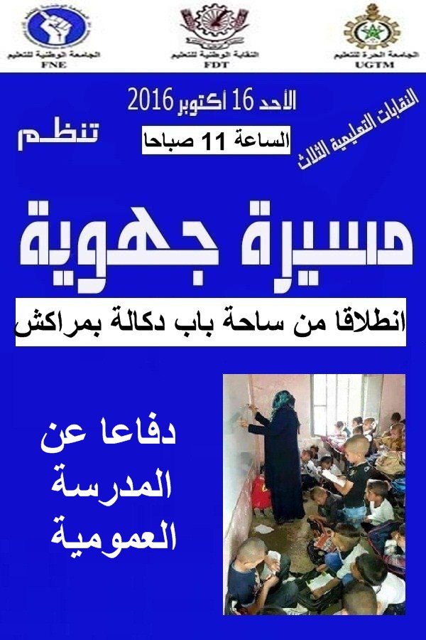 علم الموقع من مصادر قيادية في التنسبق الثلاثي أن السلطات المحلية بمراكش منعت بقرار مكتوب تنظيم المسيرة الاحتجاجية التي دعا إليها التنسيق الثلاثي للنقابات التعليمية وكرد على قرار المنع قررت المكاتب الجهوية الثلاثة بجهة مراكش أسفي للنقابة الوطنية للتعليم (فدش) والجامعة الوطنية للتعليم (التوجه الديمقراطي) والجامعة الحرة للتعليم (ا ع ش م) تنظيم وقفة احتجاجية بنفس المكان وفي نفس التوقيت (باب دكالة – مراكش الأحد 16 أكتوبر 2016 الساعة 11 صباحا ) كما علم الموقع بان القيادات الجهوية للتنسيق الثلاثي اجتمعت يوم الخميس  وستصدر بلاغا في الموضوع تدعو فيه الشغيلة التعليمية الى المشاركة  المكثفة في هذه الوقفة الاحتجاجية دفاعا عن المدرسة العمومية وحماية لحقوق الشغيلة التعليمية