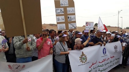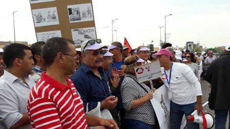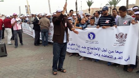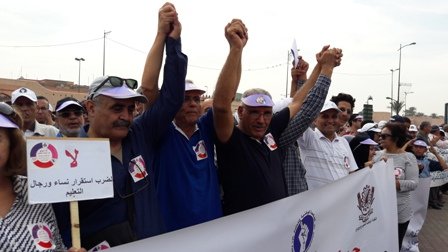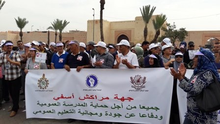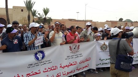 نظم التنسيق النقابي للنقابات التعليمية الثلاث الأكثر تمثيلية بجهة مراكش آسفي : النقابة الوطنية للتعليم فدش والجامعة الحرة للتعليم اع ش م والجامعة الوطنية للتعليم ـ التوجه الديمقراطي وقفة احتجاجية بباب دكالة بمراكش يوم الأحد 16 أكتوبر 2016 من الساعة 11 صباحا إلى الساعة 12 و15 دقيقة بعد الزوال للتنديد بمنع السلطات المحلية لمسيرة كان من المقرر أن تنطلق من نفس المكان ..
