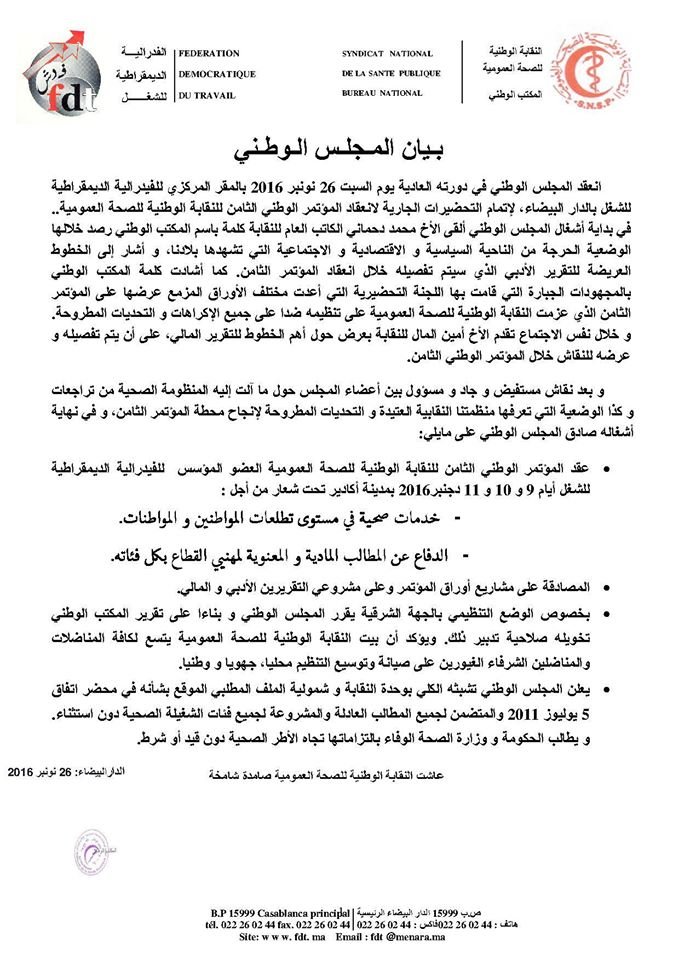في بيان المجلس الوطني للنقابة الوطنية للصحة العمومية :