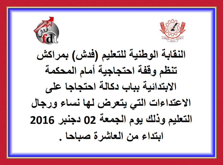 *يقرر تنظيم وقفة احتجاجية أمام المحكمة الابتدائية بباب دكالة يوم الجمعة 02 دجنبر 2016 ابتداء من الساعة العاشرة ، احتجاجا على هذه الاعتداءات المتكررة