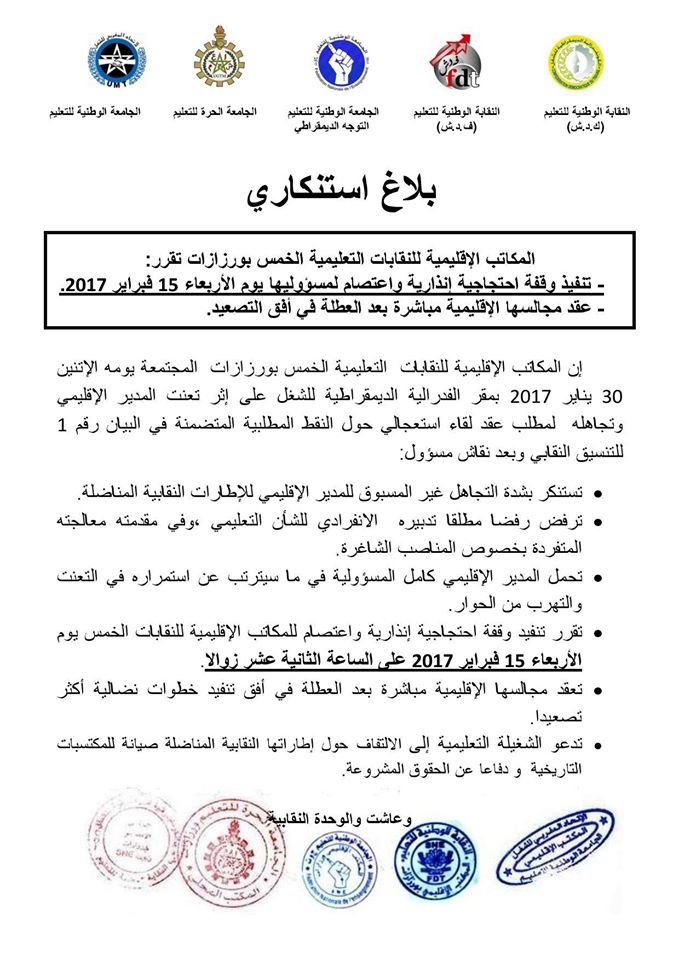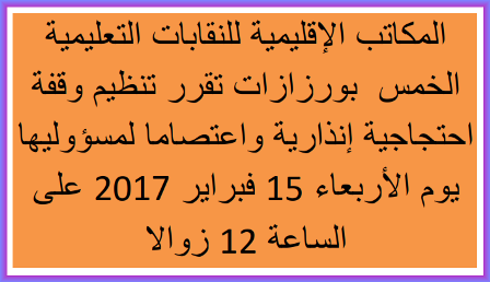 المكاتب الإقليمية للنقابات التعليمية الخمس بورزازات تقرر تنظيم وقفة احتجاجية إنذارية واعتصاما لمسؤوليها يوم الأربعاء 15 فبراير 2017 على الساعة 12 زوالا