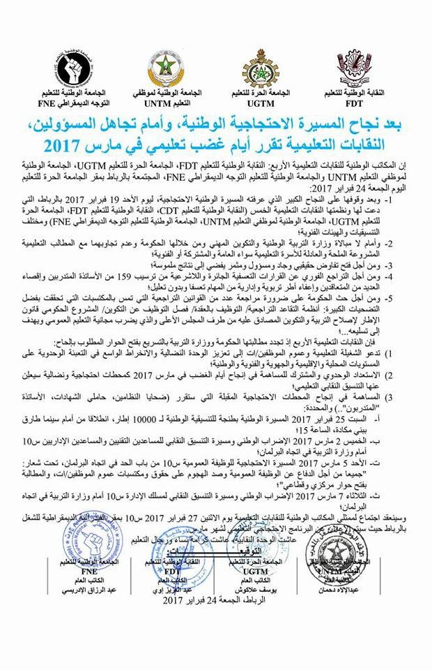 - وبعد وقوفها على النجاح الكبير الذي عرفته المسيرة الوطنية الاحتجاجية، ليوم الأحد 19 فبراير2017 بالرباط، التي دعت لها ونظمتها النقابات التعليمية الخمس: النقابة الوطنية للتعليم (CDT)، النقابة الوطنية للتعليم (FDT)، الجامعة الحرة للتعليم (UGTM)، الجامعة الوطنية لموظفي التعليم (UNTM) والجامعة الوطنية للتعليم (التوجه الديمقراطي FNE) ومختلف التنسيقيات والهيئات الفئوية.