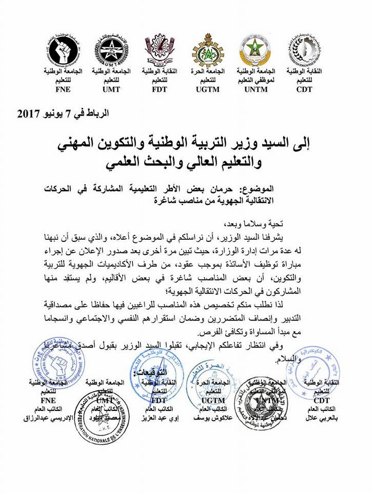 وجه الكتاب العامون للنقابات التعليمية الست الأكثر تمثيلية رسالة إلى ا وزير التربية الوطنية والتكوين المهني والبحث العلمي حول موضوع حرمان بعض الأطر التعليمية المشاركة في الحركات الانتقالية الجهوية من مناصب تبين أنها شاغرة بعد صدور الإعلان عن إجراء مباراة توظيف الأساتذة بموجب عقود من طرف الأكاديميات الجهوية للتربية والتكوين ولم يستفد منها المشاركون في الحركات الانتقالية