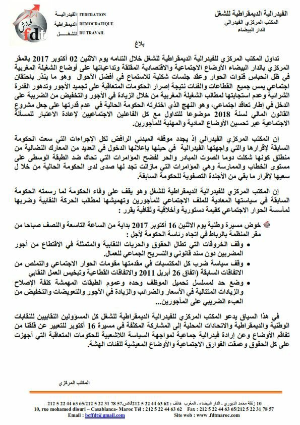 المكتب المركزي للفيدرالية الديمقراطية للشغل يقرر خوض مسيرة وطنية يوم الاثنين 16 أكتوبر 2017 بالرباط.