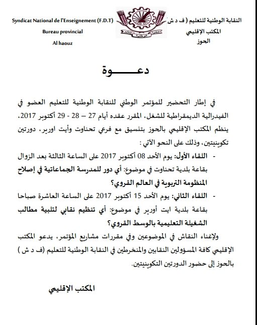 في مراسلة توصل بها الموقع، وفي إطار التحضير للمؤتمر الوطني للنقابة الوطنية للتعليم العضو في الفيدرالية الديمقراطية للشغل، المقرر عقده أيام 27 – 28 – 29 أكتوبر 2017، ينظم المكتب الإقليمي بالحوز بتنسيق مع فرعي تحناوت وأيت اورير، دورتين تكوينيتين، وذلك على النحو الآتي :