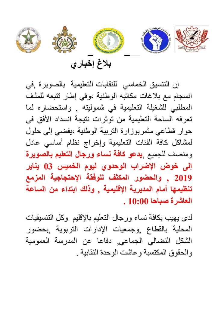 النقابات التعليمية بالصويرة تدعو إلى خوض الإضراب الوحدوي ليوم الخميس 3 يناير 2019 وحضور الوقفة الاحتجاجية الجماعية أمام المديرية الإقليمية ابتداء من الساعة العاشرة صباحا