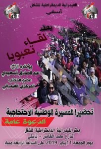 في اطار التحضير للمسيرة الوطنية الاحتجاجية الفيدرالية المقرر تنظيمها يوم 30 يناير 2019 بالرباط يعقد الاتحاد المحلي للفيدرالية الديمقراطية للشغل بأسفي لقاء تعبويا سيؤطره الاخ عبد الصادق السعيدي نائب الكاتب العام وذلك يوم الجمعة 11 يناير 2019 على الساعة الرابعة مساء بمقر الفيدرالية الديمقراطية للشغل شارع محمد الخامس باسفي .. والدعوة عامة.