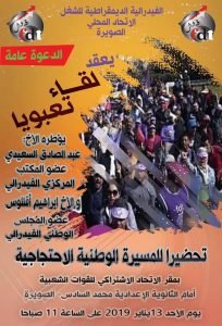 في إطار التحضير للمسيرة الوطنية الاحتجاجية الفيدرالية المقرر تنظيمها يوم 30 يناير 2019 بالرباط يعقد الاتحاد المحلي للفيدرالية الديمقراطية للشغل بالصويرة لقاء تعبويا سيؤطره الاخ عبد الصادق السعيدي نائب الكاتب العام Fdt وكاتب الاتحاد المحلي الأخ ابراهيم أفللوس وذلك يوم الأحد 13 يناير 2019 على الساعة الحادية عشرة صباحا بمقر الإتحاد الإشتراكي للقوات الشعبية بالصويرة أمام إعدادية محمد السادس….والدعوة عامة.