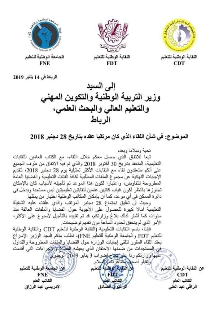 توصل الموقع بمراسلة موحدة للنقابة الوطنية للتعليم (FDT)، والنقابة الوطنية للتعليم (CDT)، والجامعة الوطنية للتعليم (FNE)، موجهة إلى وزير التربية الوطنية والتكوين المهني والتعليم العالي والبحث العلمي. تطالبه الإسراع بعقد اللقاء المقرر لتلقي إجابات الوزارة حول القضايا والملفات المطروحة والتداول في المستجدات، ومن ضمنها الاحتقان الذي يعيشه القطاع، والاجراءات التي أقدمت عليها الوزارة ردا على نجاح الاضراب الوحدوي للثالث من يناير. وفيمايلي نص المراسلة: