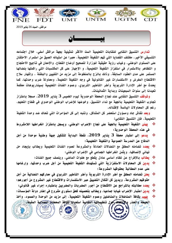 وتوقف التنسيق النقابي عند نجاح المحطة الوحدوية ليوم الخميس 3 يناير 2019، مسجلا باعتزاز تجاوب الشغيلة التعليمية بالجهة مع نداء التنسيق، وخوضها للإضراب الوطني الوحدوي في قطاع التعليم، رغم كل المحاولات اليائسة لإفشاله.
