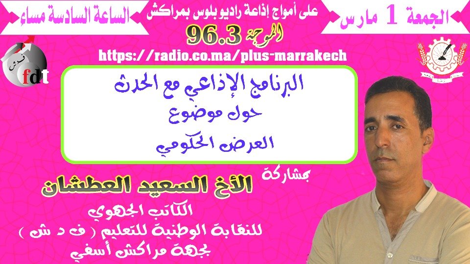 الكاتب الجهوي للنقابة الوطنية للتعليم (فدش) بجهة مراكش اسفي الاخ السعيد العطشان سيشارك البرنامج الاذاعي مع الحدث الذي تبثه اذاعة راديو بليس مع الساعة السادسة مساء (الموجة 96,3) حول موضوع : العرض الحكومي
