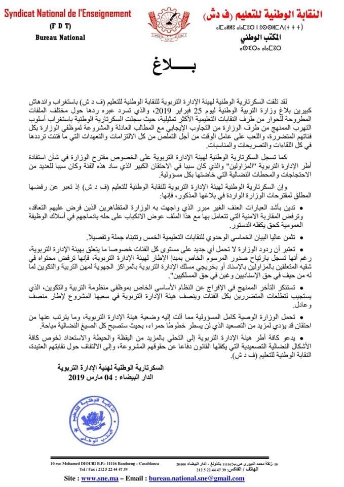 السكرتارية الوطنية لهيئة الادارة التربوية للنقابة الوطنية للتعليم (فدش) تدين العنف الذي تعرض له الاستاذات و الاساتذة المكرهين على التعاقد وتثمن بيان التنسيق الخماسي وترفض مقترحات الوزارة وتحملها كامل المسؤولية فيما آلت اليه وضعية هيئة الادارة التربوية وما يترتب عنها من احتقان قد يؤدي الى مزيد من التصعيد