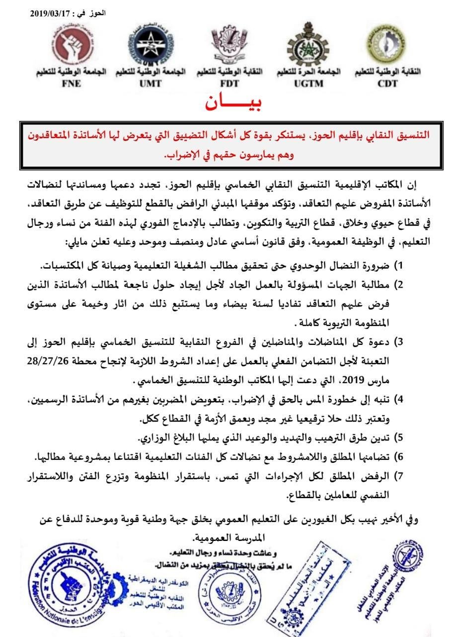 التنسيق النقابي بإقليم الحوز يستنكر بقوة كل أشكال التضييق التي يتعرض لها الاساتذة المتعاقدون وهم يمارسون حقهم في الاضراب