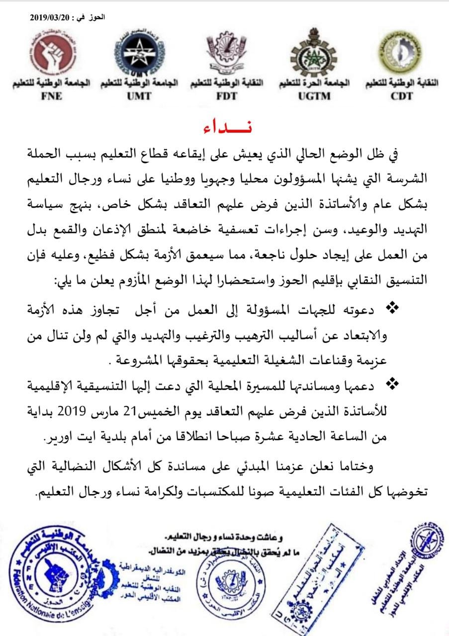 أشار نداء نقابي توصل به الموقع من المكتب الاقليمي للنقابة الوطنية للتعليم، العضو في الفيدرالية الديمقراطية للشغل باقليم الحوز، انه وفي ظل الوضع الحالي الذي يعيش على إيقاعه قطاع التعليم بسبب الحملة الشرسة التي يشنها المسؤولون محليا وجهويا ووطنيا على نساء ورجال التعليم بشكل عام والأساتذة الذين فرض عليهم التعاقد بشكل خاص، بنهج سياسة التهديد والوعيد، وسن إجراءات تعسفية خاضعة لمنطق الإذعان والقمع بدل من العمل على إيجاد حلول ناجعة، مما سيعمق الأزمة بشكل فظيع، وعليه فإن التنسيق النقابي بإقليم الحوز واستحضارا لهذا الوضع المأزوم يعلن ما يلي:
