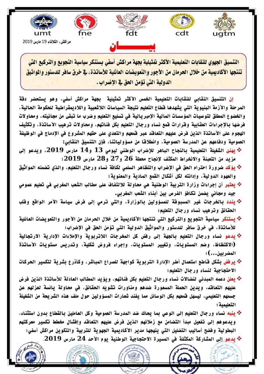 – ينبه نساء ورجال التعليم إلى الوعي بما يحاك ضد المدرسة العمومية وكل العاملين بالقطاع بدون استثناء، ويدعوهم إلى تفعيل مبدأ التضامن مع زملائهم الذين فرض عليهم التعاقد وإفشال مخطط تكسير معركتهم البطولية وفضح أساليب التضليل التي ينهجها مدير الأكاديمية الجهوية للتربية والتكوين مراكش أسفي؛