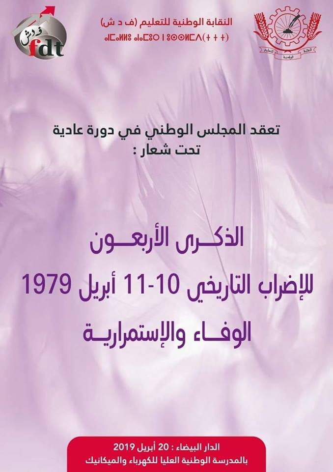 النقابة الوطنية للتعليم  (فدش) تعقد مجلسها الوطني يوم السبت 20 أبريل 2019 بالمدرسة الوطنية العليا للكهرباء والميكانيك بالدار البيضاء