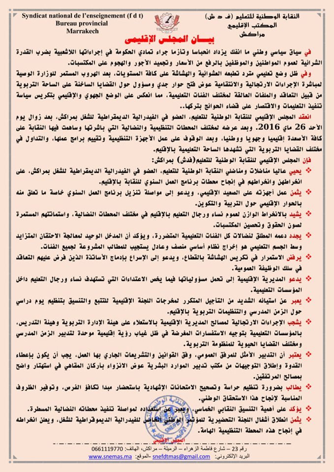 انعقد المجلس الاقليمي للنقابة الوطنية للتعليم، العضو في الفيدرالية الديمقراطية للشغل بمراكش، بعد زوال يوم الأحد 26 ماي 2016. وبعد عرضه لمختلف المحطات التنظيمية والنضالية التي باشرتها وساهمت فيها النقابة على كافة الأصعدة اقليميا وجهويا ووطنيا، وبعد الوقوف على عمل الأجهزة التنظيمية وتقييم برامج عملها، والتداول في مختلف القضايا التربوية التي تشهدها الساحة التعليمية بالاقليم.