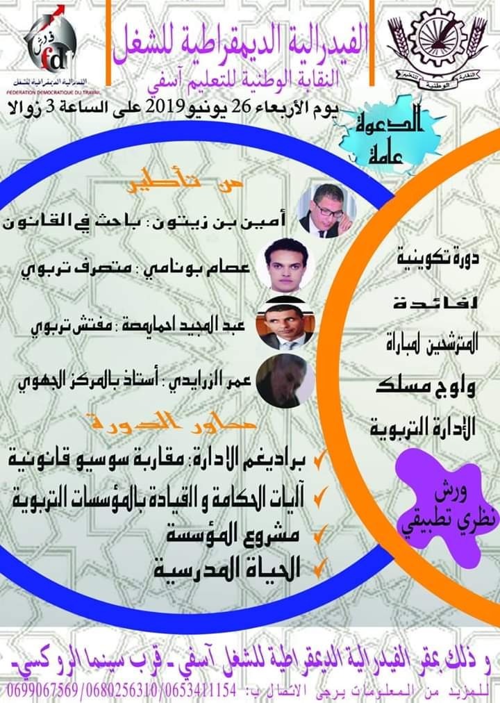 بعد تجديد جهازها الاقليمي أواخر شهر ماي الماضي، ستدشن النقابة الوطنية للتعليم، العضو في الفيدرالية الديمقراطية للشغل بأسفي سلسلة أنشطتها الاشعاعية بلقاء تكويني لفائدة الأساتذة المقبلين على اجتياز مباراة ولوج مسلك الادارة التربوية. وذلك يوم غد الأربعاء 26 يونيو 2019، ابتداء من الساعة الثالثة بعد الزوال بمقر الفيدرالية الديمقراطية للشغل بعمارة الرفاوي، قرب سينما الروكسي.