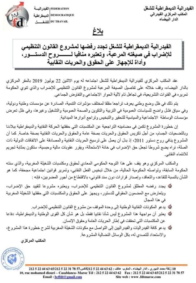 الفيدرالية الديمقراطية للشغل تجدد رفضها لمشروع قانون الإضراب في صيغته المرعبة