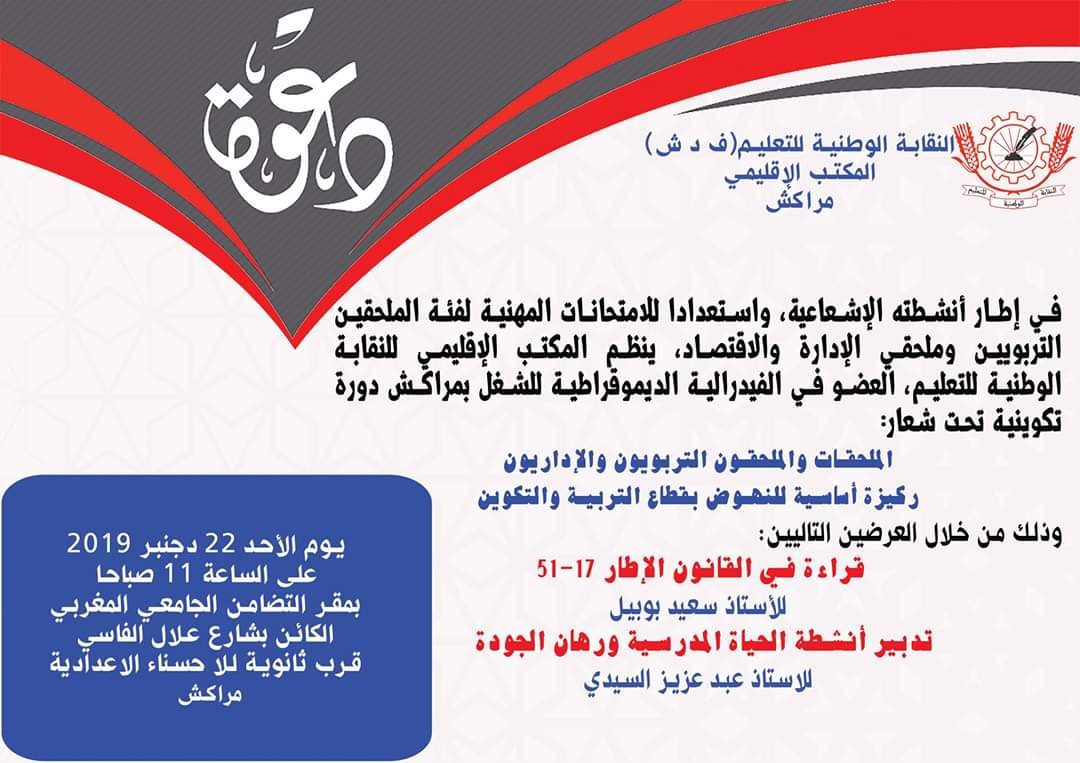 في إطار أنشطتها الاشعاعية، واستعدادا للامتحانات المهنية لفئة الملحقين التربويين وملحقي الادارة والاقتصاد، ينظم المكتب الاقليمي للنقابة الوطنية للتعليم، العضو في الفيدرالية الديمقراطية للشغل دورة تكوينية لنساء ورجال التعليم من هذه الفئة تحت شعار: