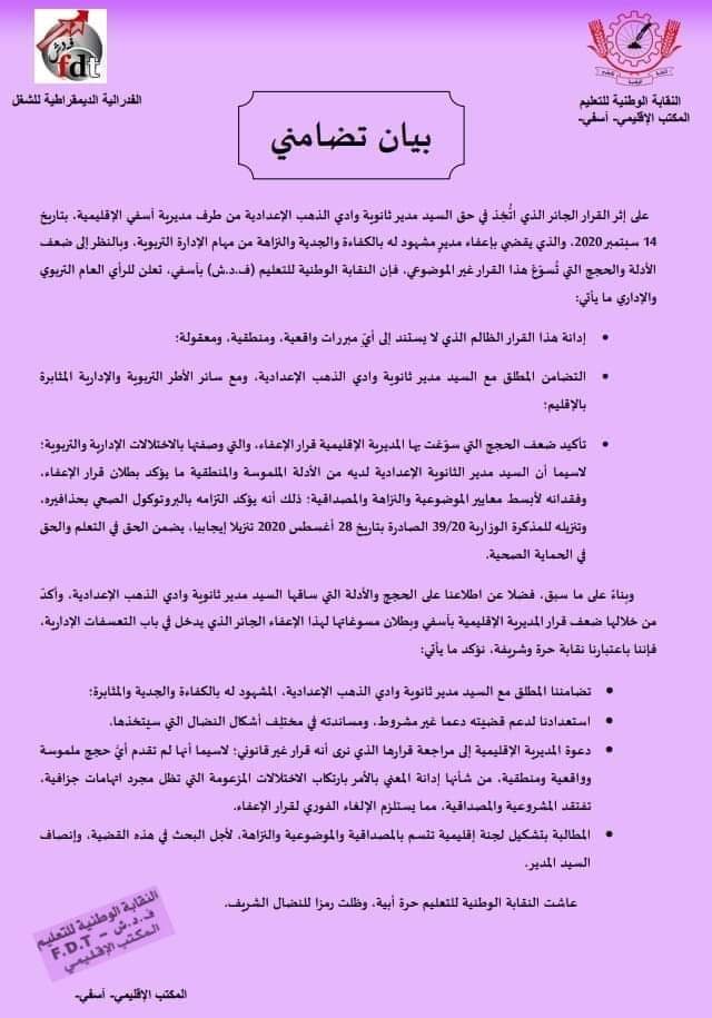 وبناءً على ما سبق، فضلا عن اطلاعنا على الحجج والأدلة التي ساقها السيد مدير ثانوية وادي الذهب الإعدادية، وأكدّ من خلالها ضعف قرار المديرية الإقليمية بآسفي وبطلان مسوغاتها لهذا الإعفاء الجائر الذي يدخل في باب التعسفات الإدارية، فإننا باعتبارنا نقابة حرة وشريفة، نؤكد ما يأتي: