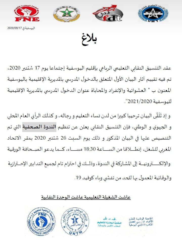 التنسيق النقابي (untm-fne-umt-fdt) يدعو الصحافة الورقية والالكترونية إلى المشاركة في ندوة صحفية حول العشوائية والانفراد والمحاباة في التدبير بالمديرية الاقليمية للتعليم باليوسفية يوم يوم السبت 26 شتنبر 2020 بمقر الاتحاد المغربي للشغل، إنطــــــــــــــــلاقا من الســـــــــــــــــاعة 18:30 مســــــاء، بمقر الاتحاد المغربي للشغل.