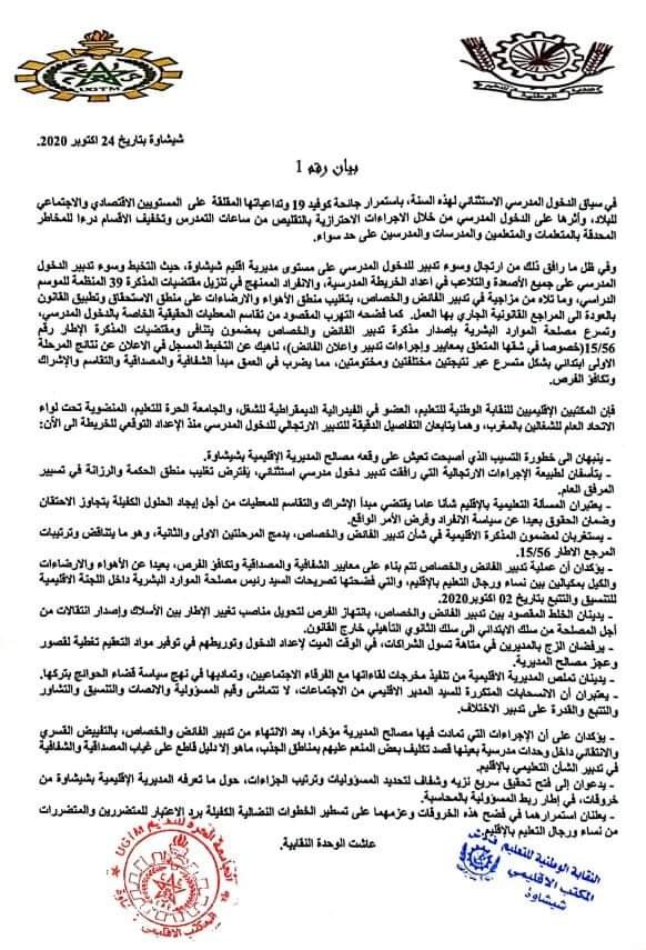 وفي ظل ما رافق ذلك من ارتجال وسوء تدبير للدخول المدرسي على مستوى مديرية اقليم شيشاوة، حيث التخبط وسوء تدبير الدخول المدرسي على جميع الأصعدة والتلاعب في اعداد الخريطة المدرسية، والانفراد الممنهج في تنزيل مقتضيات المذكرة 39 المنظمة للموسم الدراسي، وما تلاه من مزاجية في تدبير الفائض والخصاص، بتغليب منطق الأهواء والارضاءات على منطق الاستحقاق وتطبيق القانون بالعودة الى المراجع القانونية الجاري بها العمل. كما فضحه التهرب المقصود من تقاسم المعطيات الحقيقية الخاصة بالدخول المدرسي، وتسرع مصلحة الموارد البشرية بإصدار مذكرة تدبير الفائض والخصاص بمضمون يتنافى ومقتضيات المذكرة الإطار رقم 56/15(خصوصا في شقها المتعلق بمعايير وإجراءات تدبير واعلان الفائض)، ناهيك عن التخبط المسجل في الاعلان عن نتائج المرحلة الاولى ابتدائي بشكل متسرع عبر نتيجتين مختلفتين ومختومتين، مما يضرب في العمق مبدأ الشفافية والمصداقية والتقاسم والإشراك وتكافؤ الفرص.
