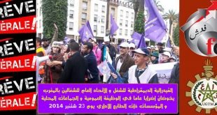 أعلنت المركزيتان الاتحاد العام للشغالين بالمغرب والفيدرالية الديمقراطية للشعل عن إضراب وطني عام في قطاع الوظيفة العمومية والجماعات الترابية والمؤسسات العمومية ذات الطابع الإداري يوم الثلاثاء 23 شتنبر 2014 ودعت المركزيتان كافة القطاعات المعنية بالإضراب إلى التزام التقنيات الآتية أثناء تنفيذ قرار الإضراب : 1 ـ بالنسبة لعموم الموظفين والمستخدمين …