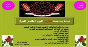 تتقدم دائرة المرأة بالمكتب الإقليمي للنقابة الوطنية للتعليم العضو في الفيدرالية الديمقراطية للشغل بمراكش ب : أجمل باقات الورد …. أعطر نسمات الود …. وبالغ عبارات التقدير والاحترام للمرأة المدرسة وللمرأة العاملة بحقل التربية والتكوين عموما ولكل النساء …. وكل 8 مارس والمرأة بألف خير حليمة شاكر منسقة دائرة المرأة …