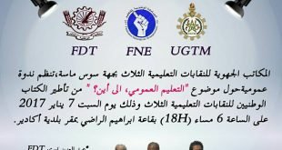 سطرت النقابات التعليمية الثلاثالنقابة الوطنية للتعليم (فدش) الجامعة الوطنية للتعليم (التوجه الديمقراطي) الجامعة الحرة للتعليم (ا ع ش م)بجهة سوس ماسة برنامجا نضاليا للدفاع عن المدرسة العمومية والمكتسبات الاجتماعية التي راكمتها الحركة النقابية عبر نضالاتها ، يبدأ بتنظيم ندوة عمومية حول موضوع “ التعليم العمومي ، إلى أين؟ ” وهي الندوة …