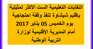 أكمل القراءة »النقابات التعليمية الست الأكثر تمثيلية بإقليم شيشاوة تنفذ وقفة احتجاجية يوم الخميس 05 يناير 2017 أمام المديرية الإقليمية لوزارة التربية الوطنية