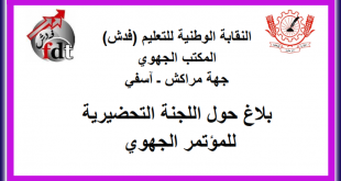 ينهي المكتب الجهوي للنقابة الوطنية للتعليم العضو في الفدرالية الديمقراطية للشغل بجهة مراكش أسفي إلى علم الأخوات والإخوة عضوات وأعضاء اللجنة التحضيرية للمؤتمر الجهوي الأول للنقابة الوطنية للتعليم (ف د ش) بالجهة، أنه سيتم عقد الاجتماع الأول لهذه اللجنة يوم الأحد 25 دجنبر 2016 على الساعة الحادية عشر (11) صباحا …
