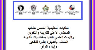 بيــــــــــــــــان إن النقابات الوطنية التعليمية: النقابة الوطنية للتعليم العالي والنقابة الوطنية للتعيم (كدش) والجامعة الحرة للتعليم (ا ع ش م) والجامعة الوطنية للتعليم (التوجه الديمقراطي) والنقابة الوطنية للتعليم (فدش) المجتمعة يومي السبت 10 دجنبر والثلاثاء 20 دجنبر 2016 بالمقر المركزي للكونفدرالية الديمقراطية للشغل بالدار البيضاء ، بعد وقوفها بالتقييم …
